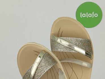 Klapki damskie CLEVÉ - Rozmiar: 39 - Typ: klapki wsuwane - Kolor: złoty/beżowy - Cholewka: szeroki pasek pokryty złotymi brokatowymi drobinkami, z połyskiem - Wkładka: gładka, w odcieniu beżu - Po...