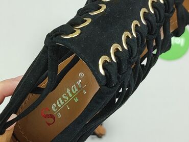 Sandały damskie Seastar - Kolor: czarny z metalicznymi zdobieniami - Rozmiar: 38 (oznaczenie na podeszwie) - Styl: pasek na palcach oraz pasek wokół kostki - Zapięcie: podwójne klamry w stylu west...
