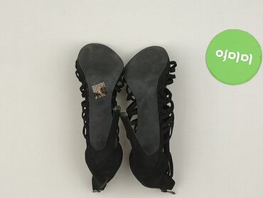Czółenka/sandały na słupku z odkrytymi palcami - Rozmiar: 41 (oznaczenie na spodzie) - Cholewka: czarna, zamszowa w dotyku - Wnętrze/wkładka: fioletowa - Zapięcie: pasek na pięcie z klamrą, regulo...