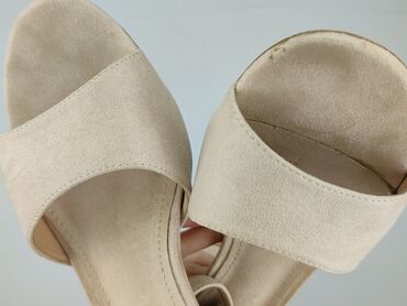 Sandały damskie na koturnie, beżowe - Rozmiar: 38 (oznaczenie na podeszwie) - Kolor: jasny beż - Cholewka: skóra/licowana skóra z ażurowymi wycięciami w kwiatowe wzory - Zapięcie: pasek przy kostc...