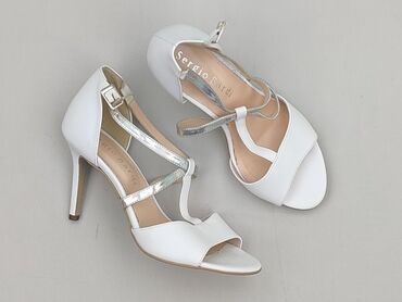 Sandały damskie na szpilce, beżowe/champagne z ozdobnymi paseczkami wysadzanymi drobnymi kryształkami. - Model: odkryte palce, zabudowana pięta - Obcas: wysoki, smukła szpilka - Zapięcie: pasek z ...