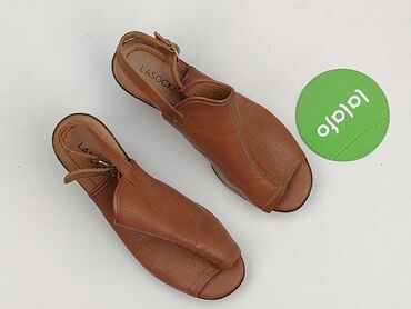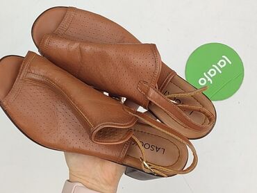 Sandały damskie Lasocki - Model: odkryte palce, pasek na pięcie - Rozmiar: 41 (oznaczenie na podeszwie) - Materiał: skóra naturalna (Vera Pelle) – cholewka i wkładka - Kolor: czerwony, fakturowana...
