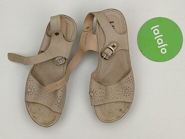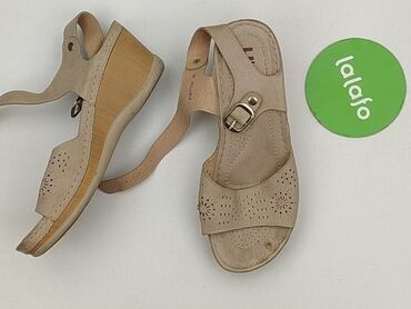 Beżowe sandały damskie na koturnie - Model: odkryte palce, odkryta pięta, pasek ze sprzączką - Materiał: naturalna skóra (cholewka i wkładka – oznaczenia skóra wewnątrz) - Podeszwa: koturna z fakt...