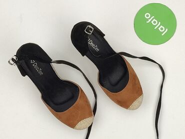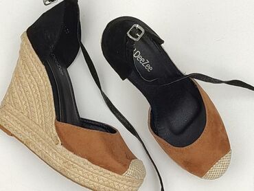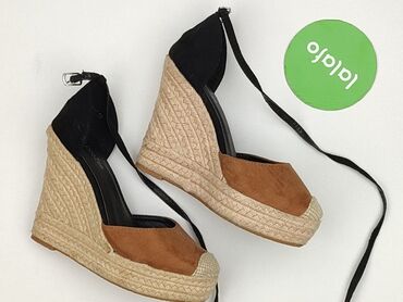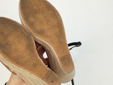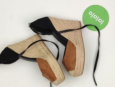 Sandały na koturnie Jenny Fairy - Model: peep toe z wycięciami po bokach - Rozmiar: 38 (oznaczenie na wkładce) - Kolor: czarny z czarno-białym wzorem na koturnie - Cholewka: zamszopodobna, miękka ...