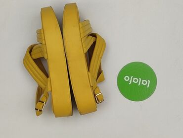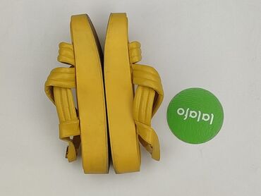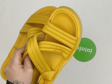 Sandały damskie w kolorze intensywnej żółci. - Rozmiar: 36 (oznaczenie na podeszwie) - Model: płaskie klapki z kwadratowym noskiem - Cholewka: szeroki, marszczony pasek z falbanką z przodu - Dodat...Stan: