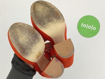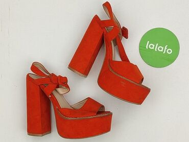 Czerwone damskie sandały na koturnie - Rozmiar: 39 (oznaczenie na podeszwie) - Cholewka: czerwony zamsz/miękka tkanina z laserowymi perforacjami w kształcie serduszek - Nosek: otwarty - Zapięcie: ...
