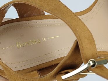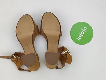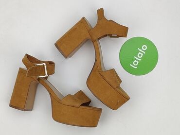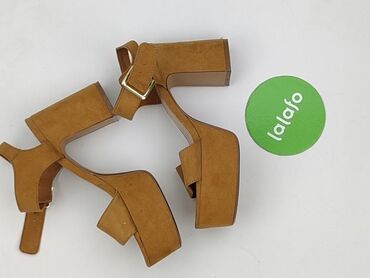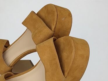 Sandały damskie na koturnie - Kolor: beżowy/nude - Cholewka: zamszowa (materiał o miękkiej, matowej fakturze) - Nosek: otwarty - Zapięcie: pasek wokół kostki z metalową, złotą klamerką i regulacją...