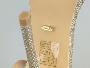 Klapki damskie na obcasie DeeZee, rozmiar 37. - Model: mule/klapki z odkrytymi palcami - Nosek: kwadratowy - Obcas: wysoki, kielichowy/flared heel, stabilny - Cholewka: połyskująca, pokryta drobny...Sandały damskie DeeZee na wysokim obcasie