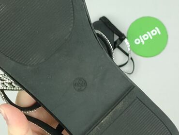 Klapki damskie z ozdobnymi koralikami - Model: wsuwane klapki na płaskiej podeszwie - Rozmiar: 40 (oznaczenie na wkładce i podeszwie) - Kolor: czarny pasek, jasnobeżowa wkładka - Cholewka: szeroki...