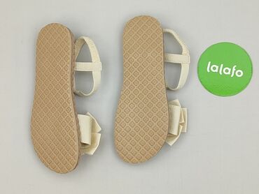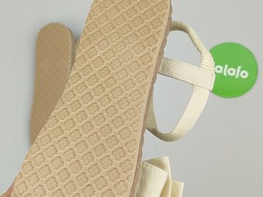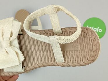 Japonki damskie - Rozmiar: 39 (oznaczenie na podeszwie) - Kolor: czarny (podstawa) z metalicznymi, złotymi paskami w kształcie V - Model: klasyczne japonki typu flip-flop - Materiał: - Paski: sy...Sandały dziewczęce z kokardą – kremowe