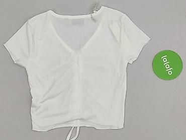 Biała bluzka damska z krótkim rękawem - Fason: luźny, oversize; lekko opadające rękawy - Dekolt: w kształcie litery V z krótką stójką - Materiał: 100% poliester (metka na zdjęciu) - Rozmiar z metk...