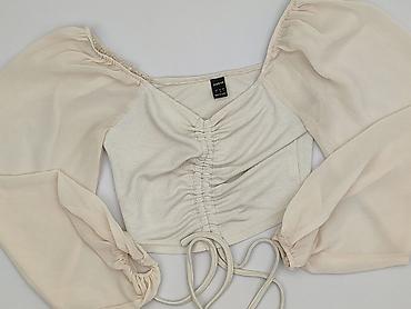 Bluzka damska SHEIN, rozmiar S (EU 36, US 4). Krótki top w kolorze ecru/kremowym z efektownymi, długimi bufiastymi rękawami z lekkiego szyfonu. Dekolt w kształcie serca/kwadratu, marszczenie i ściągana regulacja na środku przodu z długim sznurkiem do wiązania. Elastyczny, prążkowany korpus ładnie dopasowuje się do sylwetki.