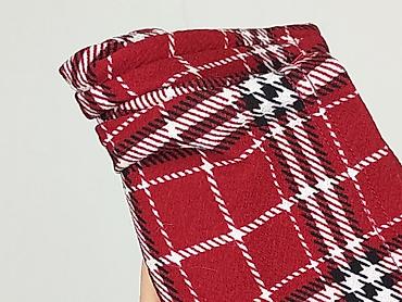- Wzór: czerwona krata (tartan) z białymi i czarnymi akcentami