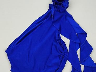 Model asymetryczny na jedno ramię, w intensywnym kobaltowym kolorze. Po lewej stronie długie, efektowne falbanki/wiązanie tworzące dekoracyjny akcent. Marszczenia po bokach ładnie podkreślają sylwetkę.