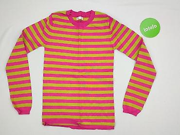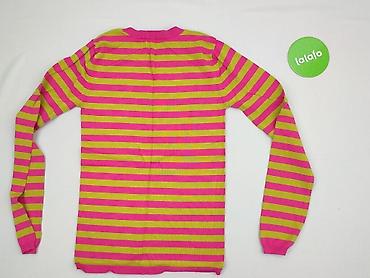 Sweter damski w pasy, rozmiar M - Krój: klasyczny, z okrągłym dekoltem - Wzór i kolory: poziome pasy w odcieniach szarości, kremu i brązu; drobne ażurowe prześwity między pasami - Materiał: 100% p...