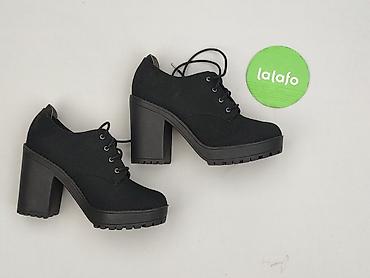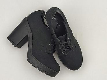 Czarne damskie czółenka/oxfordy na słupku - Rozmiar: 37 (oznaczenie na podeszwie) - Kolor: czarny - Cholewka: tkanina o delikatnym, satynowym połysku - Nosek: kwadratowy - Zapięcie: sznurowane - O...