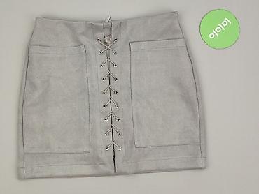 Spódnica damska 100k, rozmiar 12 - Fason: ołówkowy, długość mini - Stan: używana - Kolor: grafitowy/szary z efektem sprania - Wysoki stan z trójkątną wstawką ozdobioną metalowymi nitami z przodu -...