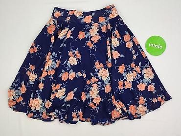 Spódnica damska w kwiaty, rozmiar S - Krój: rozkloszowana, z falbaną na dole - Wzór: drobne kwiaty (odcienie żółci, bieli i zieleni) na granatowym tle - Talia: elastyczna gumka, wygodnie dopasowuj...