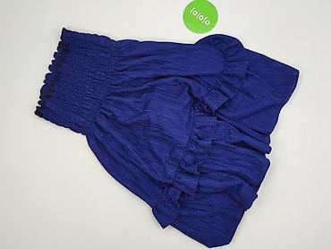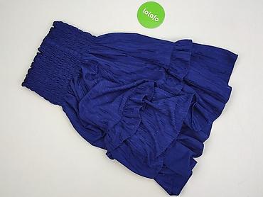 Granatowa spódnica damska, rozmiar M. - Krój: rozkloszowana, z delikatnymi zakładkami, podwójna/warstwowa falbana u dołu. - Pas: szeroki, gładki, z dekoracyjną taśmą z połyskiem (efekt drobnych ce...