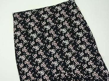 Spódnica damska w kwiaty, rozmiar 38 - Kolor bazowy: czarny - Wzór: roślinny/kwiatowy w odcieniach fioletu, pomarańczu i bieli - Krój: kopertowy/zakładany z falbaną z przodu, lekko rozszerzana ku ...