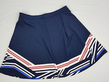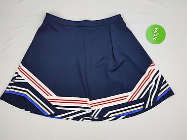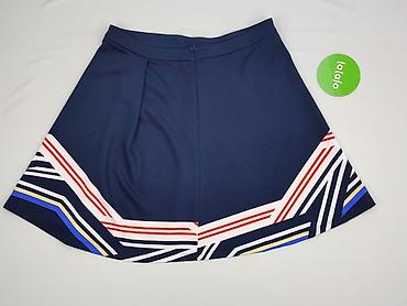 Spódnica damska, rozkloszowana, granatowa z geometrycznym wzorem przy dole.