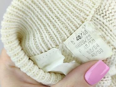 - Materiał: grubsza dzianina akrylowa/syntetyczna (metka z numeracją rozmiarów, brak czytelnego składu)