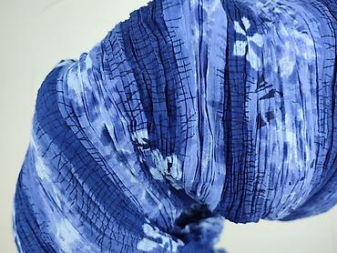 - Kolorystyka: odcienie niebieskiego (granat/błękit) z roślinnym motywem i pionowymi pasami