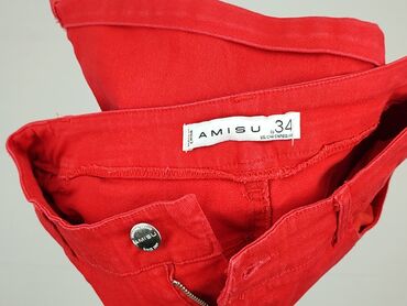 Czerwone spodenki damskie marki AMISU w rozmiarze 34. Model z pięcioma kieszeniami: dwoma z przodu, jedną małą wewnętrzną i dwoma z tyłu. Spodenki posiadają szlufki na pasek oraz zapięcie na zamek błyskawiczny i metalowy guzik. Idealne na lato, casualowe wyjścia czy do codziennego użytku.