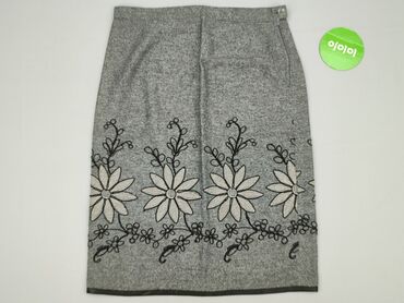 Szara spódnica w kwiaty - Krój: prosty, długość do kolan - Talia: elastyczna guma, komfortowe dopasowanie - Wzór: delikatne, białe kwiaty z żółtym środkiem na szarym tle; subtelne roślinne gałązki...