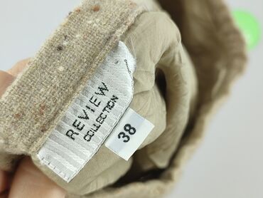 Na co dzieńBeżowa spódnica damska marki Review Collection w rozmiarze 38, wykonana z tkaniny z widocznymi, drobnymi wplecionymi włóknami. Krótka spódnica ma zapięcie na zamek błyskawiczny z tyłu i guzik w pasie. Jest to uniwersalny element garderoby, odpowiedni do różnorodnych stylizacji.