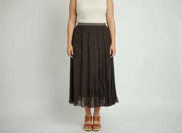 Na co dzieńSpódnica damska w kolorze ciemnobrązowym, charakteryzująca się długością maxi i swobodnym, lejącym krojem, który zapewnia komfort noszenia. Ozdobiona jest drobnymi cekinami, ułożonymi w rzędy i wzory, co dodaje jej subtelnego blasku. Materiał, z którego wykonano spódnicę, jest cienki i lekko przezroczysty, co sprawia, że idealnie nadaje się na ciepłe dni lub jako element stylizacji wieczorowych. W pasie znajduje się elastyczna gumka, a spódnica posiada wszytą podszewkę, zapewniającą dyskrecję. Jej uniwersalny design pozwala na łączenie jej zarówno z eleganckimi, jak i casualowymi elementami garderoby.