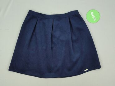 Granatowa spódnica damska z zakładkami - Krój: lekko rozkloszowany, z kontrafałdami z przodu i z tyłu - Talia: średnia, gładki pas - Zapięcie: metalowy suwak z tyłu (złoty) - Długość: mini/tuż nad...