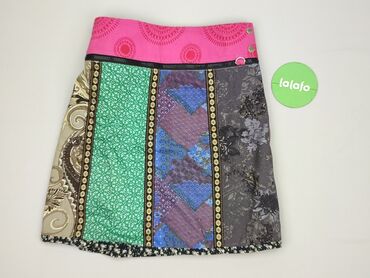 Spódnica damska Studio CYVOLD, rozmiar EU S (UK S, US XS). - Krój: rozkloszowana, długość przed kolano. - Talia: szeroki, elastyczny pas w biało‑czarne paski. - Wzór: wielobarwny, etniczny/geometr...Stan: