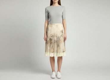 - Krój: lekko plisowana/karbowana struktura, miękko układające się fałdy, długość midi