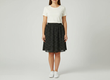 Spódnica damska Blue Motion - Rozmiar: S (36/38) - Fason: lekko rozkloszowana, długość do kolan - Talia: elastyczna guma + troczek do regulacji - Wzór: czarne tło w biały, drobny geometryczny prin...