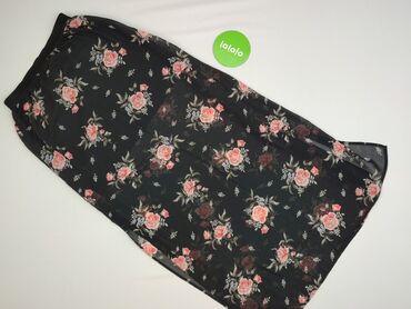Spódnica damska w kwiaty - Krój: rozkloszowana, lekko trapezowa, długość mini/tuż nad kolano - Wzór: drobne białe kwiatuszki z akcentami żółci i różu na czarnym tle - Pas: szeroka, marszczona guma...