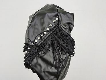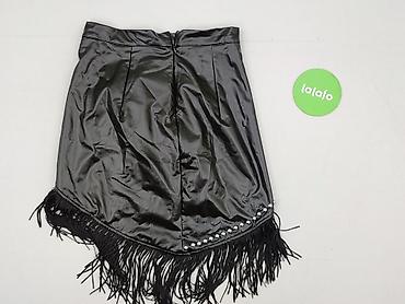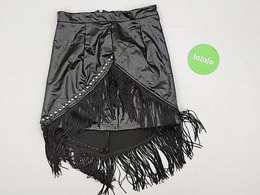 Spódnica damska, rozmiar M, czarna, efekt skóry (60% PU, 40% rayon). Model mini z asymetrycznym dołem i długimi frędzlami. Przód ozdobiony linią srebrnych nitów/koralików biegnącą po skosie; frędzle wszyte wzdłuż ozdobnego cięcia tworzą warstwowy efekt. Talia gładka, z tyłu kryty suwak. Materiał lekko połyskujący, od środka delikatna podszewka/miękka warstwa dla komfortu. Idealna do stylizacji wieczorowych, koncertowych lub imprezowych w klimacie rock/boho. Made in China.