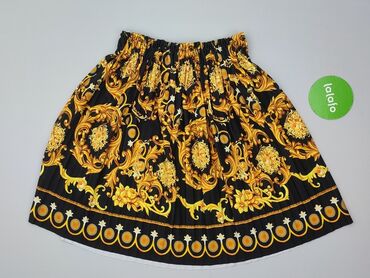 Spódnica damska z rozkloszowanym dołem i wyrazistym, roślinnym nadrukiem. - Krój: delikatnie rozszerzany, sięga mniej więcej przed kolano. - Góra w kolorze czarnym, dół z wielobarwnym wzorem botan...Stan: