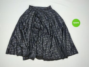 Czarna spódnica EDIT by Mark Heyes, rozmiar 12 (na metce). - Fason: rozkloszowana, z marszczeniami/zaszewkami z przodu, dwuwarstwowy dół z delikatną falbaną. - Wzór: białe, nieregularne pociągn...