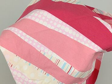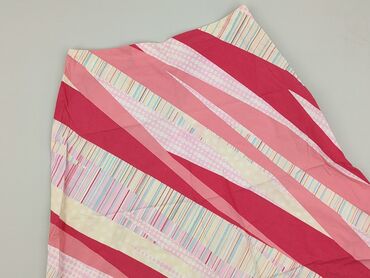 Model o kroju lekko rozkloszowanym, sięgający do kolan. Wzór patchworkowy z ukośnymi pasami w odcieniach różu, czerwieni, kremu oraz pastelowych pasków i kropek – efektowna, letnia stylistyka.