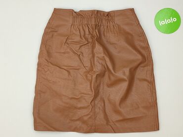 Spódnica damska z ekoskóry, kolor karmelowy/brązowy. - Fason: ołówkowy mini z marszczoną, wysoką talią typu paper bag - Talia: elastyczna (gumka) + szlufki na pasek/sznurek - Kieszenie: dwie duże,...Stan: