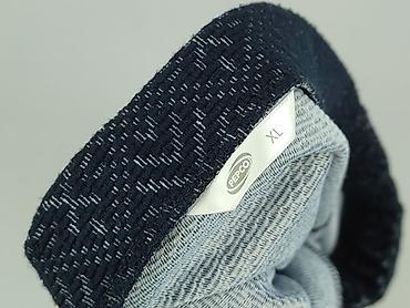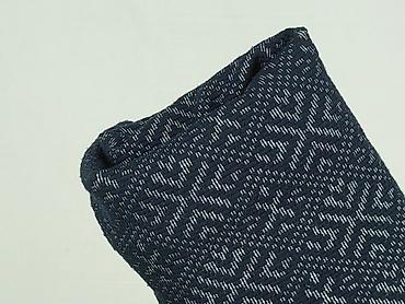 - Wzór: ciemnogranatowa dzianina z geometrycznym, jasnym motywem (all-over)