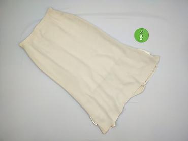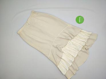 Spódnica damska w kolorze kremowym/ecru, rozmiar 38. Klasyczny krój ołówkowy z przodu, z tyłu efektowne, asymetryczne wykończenie z falbaną z plisowanego materiału w jaśniejszym odcieniu – elegancki, kobiecy akcent. Gładka tkanina z lekkim połyskiem, podszyta. Zapięcie z tyłu na suwak i guzik. Idealna do stylizacji wizytowych i do biura.