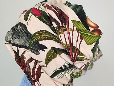 - Wzór: botaniczny/ornitologiczny – intensywne motywy liści, kwiatów i ptaków na jasnoróżowym tle
