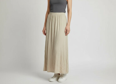 Spódnica damska w kolorze beżowym, wykonana z lekkiego materiału. Charakteryzuje się luźnym krojem, który zapewnia swobodę ruchów. W pasie znajduje się elastyczna gumka oraz szlufki, co umożliwia d...