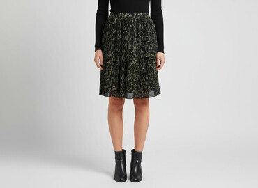 Na co dzieńSpódnica damska z plisami, utrzymana w odcieniach czerni i zieleni, z deseniem przypominającym moro lub zwierzęcy. Plisowana tkanina nadaje spódnicy lekkości i swobody ruchu, a wzór sprawia, że jest uniwersalna i łatwa do stylizowania zarówno na co dzień, jak i na bardziej uroczyste okazje. W pasie znajduje się elastyczny ściągacz, zapewniający komfort noszenia i dopasowanie do sylwetki. Idealna do tworzenia różnorodnych zestawów, pasująca do wielu stylizacji.