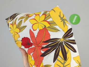 - Wzór: intensywny, tropikalny print w liście i kwiaty (żółte, czerwone, brązowe) na jasnym tle