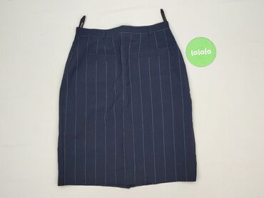 Spódnica damska w drobne pionowe paski (granat/biel), długość do kolan. - Krój: ołówkowy, z rozporkiem z tyłu dla swobody ruchów - Talia: szlufki na pasek; ozdobne listwy z guzikami z przodu po ob...
