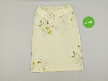 Spódnica damska ołówkowa z nadrukiem kwiatowym - Krój: ołówkowy, długość do kolan - Tkanina: gładka, lekko połyskująca, z podszewką - Kolor bazowy: ecru/kość słoniowa - Wzór: malarskie kwiaty – in...Stan: