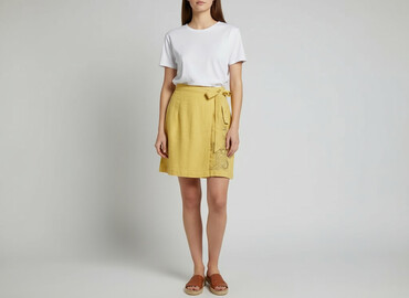 Spódnica kopertowa RESERVED, rozmiar M - Fason: kopertowy, wiązana tasiemką z boku + kryty zamek - Długość: midi - Materiał: lekka, zwiewna tkanina (syntetyk z podszewką – na zdjęciach widać struk...Żółta spódnica kopertowa Reserved w rozmiarze 38, wykonana z mieszanki poliestru i bawełny. Posiada ozdobny wzór w kolorze szarym, dodający jej charakteru. Idealna do letnich stylizacji, zapewniająca komfort noszenia.